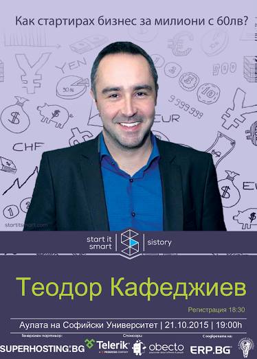 На 21 октомври от 19 ч. в Аулата на Софийски университет „Св. Климент Охридски“ ще се проведе лекция на предприемача Теодор Кафеджиев, който ще говори на тема „Как стартирах бизнес за милиони с 60 лв“. Организатор е клубът по предприемачество Start It Smart, а събитието е част от поредицата лекции на успешни предприемачи, организирани от клуба под името „SIStory” (Successful Inspirational Story).