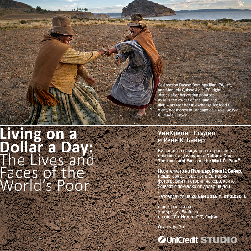 На 20 май Галерията за съвременно изкуство УниКредит Студио представя световноизвестната фотографска изложба Living On A Dollar A Day: The Lives and Faces of the World’s Poor на носителката на награда „Пулицър“ Рене K. Байер. Експозицията ще бъде отворена за посетители до 10 юни в централния филиал на банката на площад „Света Неделя“ 7. Байер лично ще бъде домакин на откриването на изложбата.